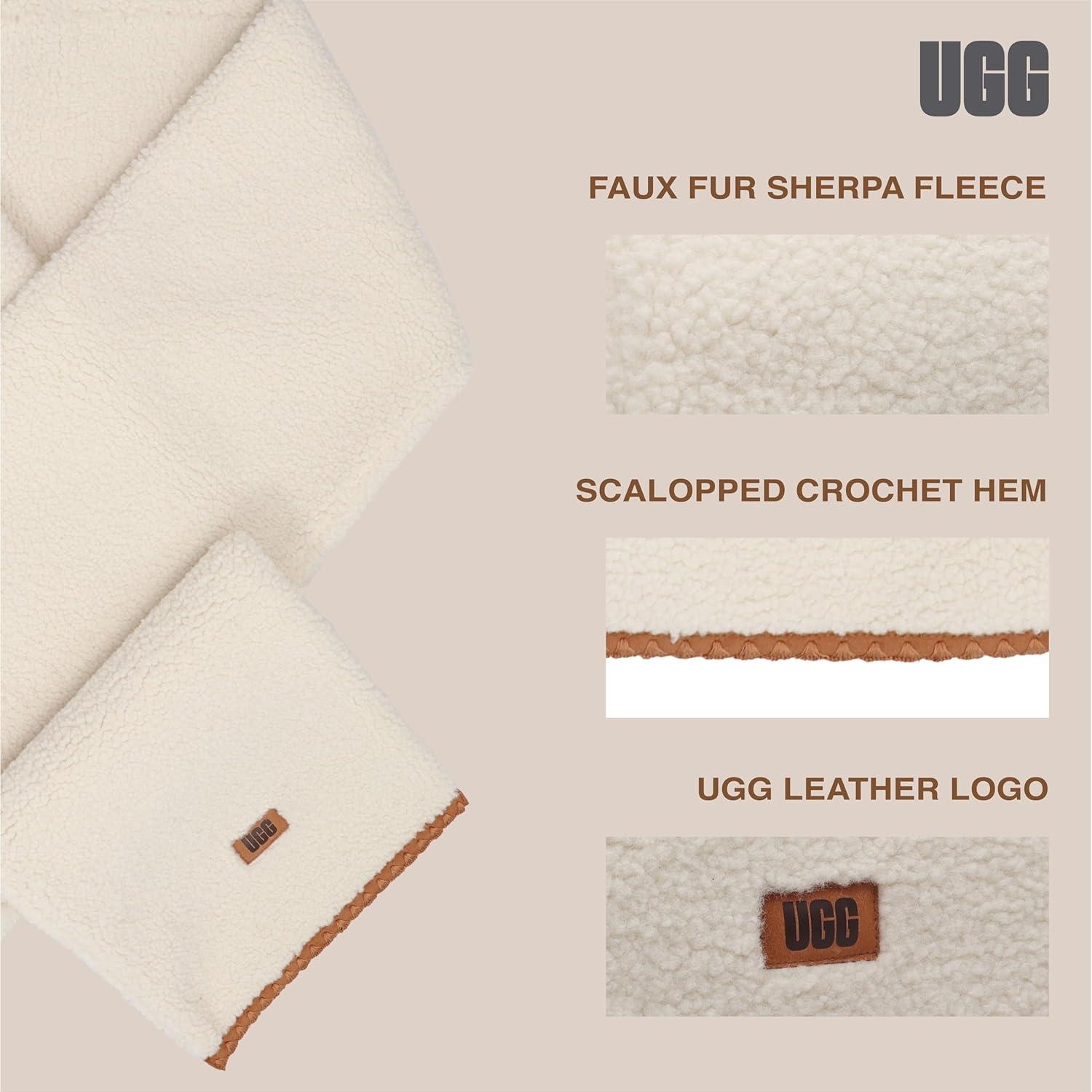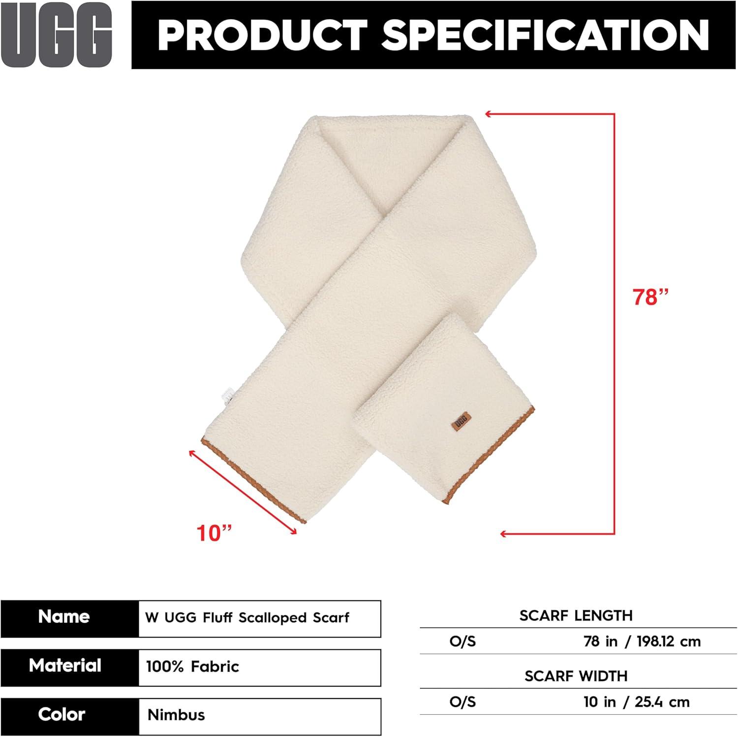 Stay warm and fashionable this winter with the UGG Women's Uggfluff Scalloped Scarf, a must-have accessory for the colder months. Crafted from plush fleece, this scarf offers a soft and luxurious feel, wrapping you in warmth and comfort. Its unique scalloped trim along the edges adds a feminine and stylish touch, setting it apart from ordinary scarves. Measuring 78 inches long and 7 inches wide, it provides generous coverage, allowing you to style it in multiple ways—whether wrapped snugly around your neck or worn draped over your shoulders. The leather label featuring the UGG graphic font adds an elegant detail, combining sophistication with the cozy design. Whether you're dressing up for a night out or simply layering for warmth on your daily commute, this scarf is a versatile accessory that enhances any winter outfit. Its plush fleece material ensures you'll stay comfortable even in the coldest conditions, making it perfect for outdoor activities, running errands, or adding a chic finish to your seasonal style. Elevate your winter wardrobe with this cozy yet stylish scarf, designed to keep you warm without sacrificing elegance.